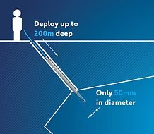 Un sistema de varillas livianas y articuladas de 1 m proporciona una capacidad de azimut fijo y permite el despliegue de C-ALS en pozos de hasta 200 m. C-ALS también se puede implementar con una pluma o con un vehículo a control remoto.